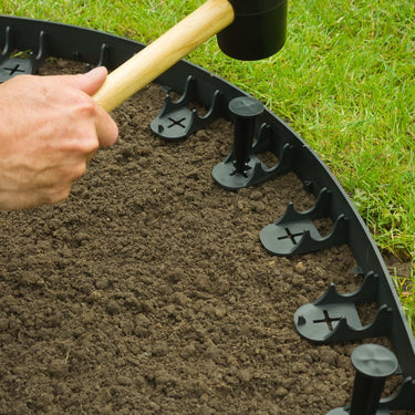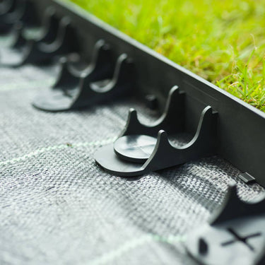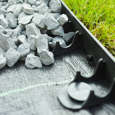 O seu design permite inserir um feltro geotêxtil na borda e fixá-lo com as âncoras, antes de cobri-lo com cascalho, calcário ou outros agregados. Esta borda de jardim flexível é feita de polipropileno e polietileno reciclado (para lhe permitir toda a sua flexibilidade). É utilizada para desenhos retos, curvos ou circulares (com um diâmetro mínimo de 32 cm). É colocada diretamente em solo macio e fixada com as estacas de ancorar (incluídas na entrega).