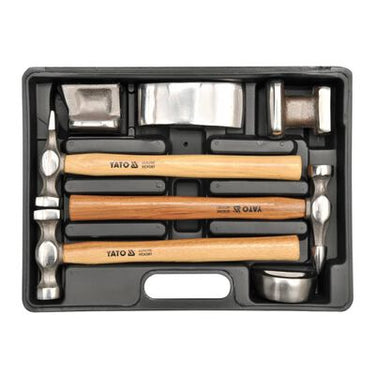 O conjunto para reparação de bate-chapas é um kit prático e eficaz para conformar chapas de aço. As superfícies de trabalho minuciosamente adaptadas dos martelos e tais / encontradores fazem com que seja possível obter vários planos da chapa perfilada.