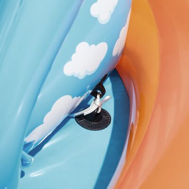 Feita com materiais robustos, esta piscina insuflável colorida e peculiar com palmeiras e uma rampa pode conter até 208 L de água. A piscina pode ser configurada de forma rápida e fácil. Possui um pulverizador de água que pode ser anexado à sua mangueira de jardim, um escorrega removível com cordas de fixação e ilhós embutidos, um anel insuflável para fazer arremessos, um túnel de lava estimulante e bolas para rolar para cima e para baixo na rampa insuflável. Uma secção do piso da piscina pode ser insuflada para servir como uma almofada para o escorrega.
