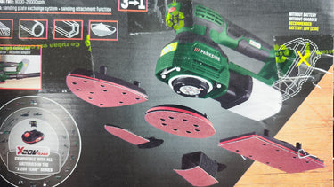 - Lixadeira multifuncional 3 em 1 com discos oscilantes, excêntricos e delta, substituíveis sem necessidade de ferramentas.