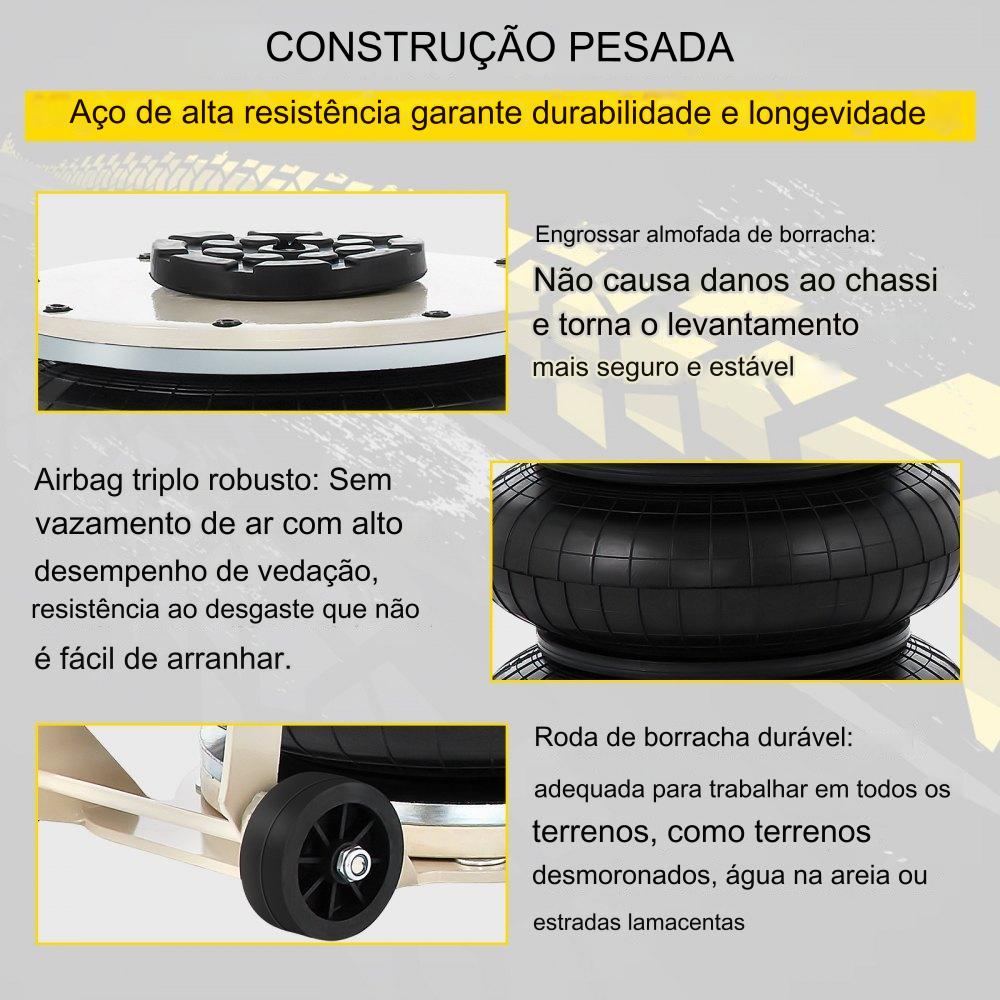 Este dispositivo é fácil de usar e poderoso. Utiliza ar comprimido para inflar e possui um saco giratório, tornando-o a maneira mais fácil e rápida de levantar o carro. É especialmente adequado para terrenos macios e fáceis de desmoronar, como estradas arenosas ou lamacentas. É ideal para famílias com carros, minivans e veículos off-road SUV.