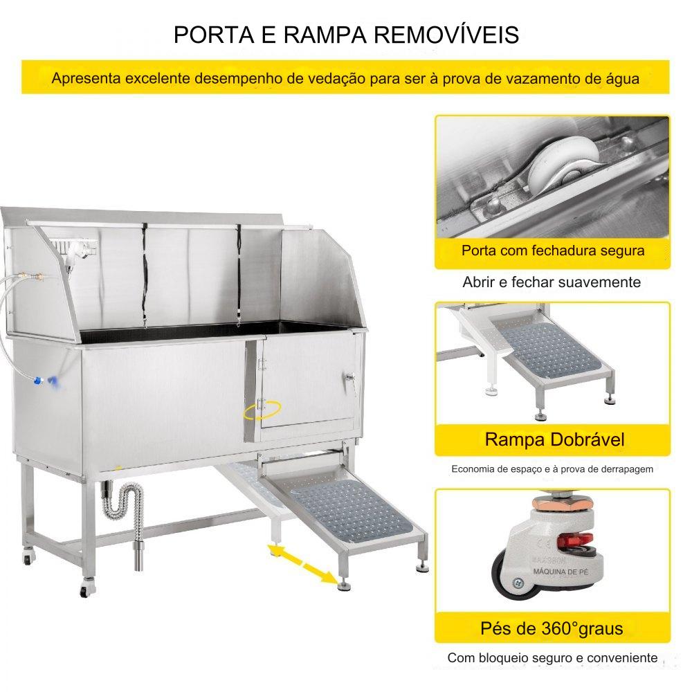 Feita de aço inoxidável 304, esta banheira de cães garante excelente desempenho ao ser resistente a deformação, ferrugem, riscos e durável. Sua construção totalmente soldada garante uma vedação excepcional, evitando vazamentos de água. Além disso, a banheira possui uma porta de correr na lateral direita, permitindo manter o seu animal de estimação seguro durante o banho.
