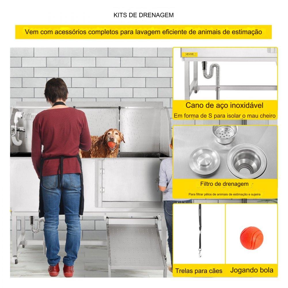A Banheira para Cães em Aço Inoxidável é projetada para oferecer um ambiente de banho seguro e confortável para seu animal de estimação. Com o tamanho de 150,4 x 70,3 x 147 cm, esta banheira é adequada para animais de estimação com um comprimento máximo de 149,9 cm. Possui capacidade de peso de até 300 kg, tornando-a adequada para cães de diferentes tamanhos.