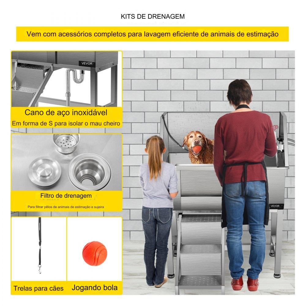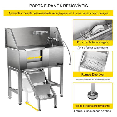 A Banheira de Aço Inoxidável para Cuidados de Animais de Estimação é perfeita para manter seu animal de estimação limpo e confortável. Com um tamanho de 86,8 x 46,7 x 110,4 cm, é adequada para animais de estimação com comprimento máximo de 86,4 cm. Esta banheira possui espaço suficiente para cães de diferentes tamanhos, suportando até 90,7 kg.