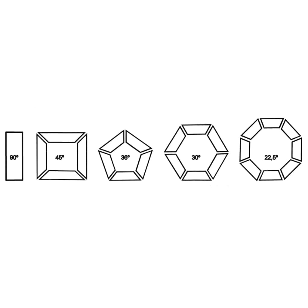 • Configurações de ângulo: 90°/0°, 75°/15°, 67,5°/22,5°, 60°/30°, 54°/36°, 45°
