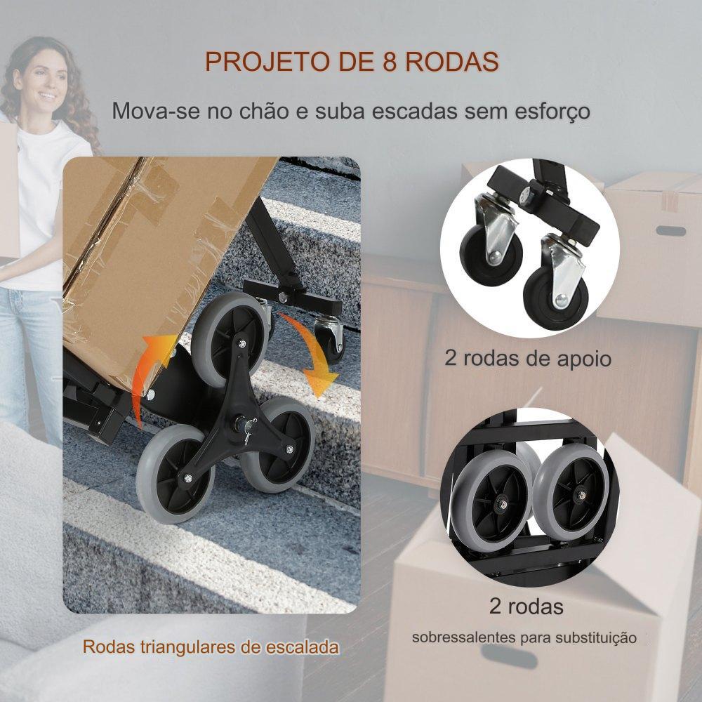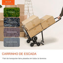 Pensando em sua comodidade, o carrinho possui rodas triangulares especiais para escadas, que facilitam a subida e a descida em superfícies elevadas. A alça acolchoada também foi projetada para prevenir danos nas articulações durante o transporte. Com rodas de borracha e amortecedores, o carrinho garante um deslizamento suave e silencioso em diferentes tipos de terreno, como grama, paralelepípedos, concreto e estradas de cascalho.