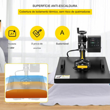 Sistema de controle digital: A prensa a quente possui um painel de controle preciso, que permite regular a temperatura e o tempo de operação com precisão. Após o processo de aquecimento ser concluído, um alarme soará automaticamente para lembrar o usuário de remover os objetos.