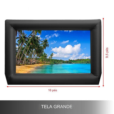 A tela de projeção inflável é projetada para criar uma área de visualização ampla em tamanho real. Com dimensões de 488 cm x 220 cm x 290 cm, proporciona uma experiência premium de cinema e teatro ao ar livre ao ser conectada a qualquer projetor.
