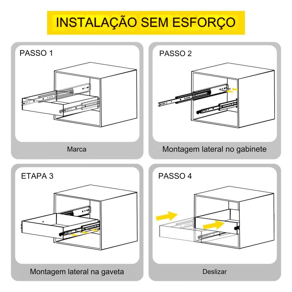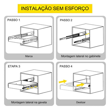 【MOVIMENTO SUAVE】 - Equipados com rolamento de esferas duplo, os trilhos proporcionam um movimento suave e livre de atrito ao abrir e fechar as gavetas. Possuem um botão de liberação amarelo que trava a gaveta e evita escorregamentos.