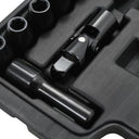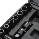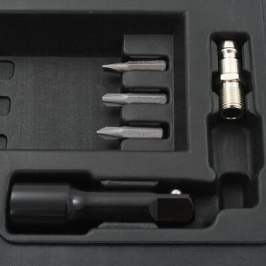 Este conjunto contém 1 aparafusadora de impacto angular, 7 chaves de diferentes tamanhos, 1 barra de extensão, 1 adaptador, 1 junta universal, 1 recipiente para óleo, 1 suporte para pontas e 3 pontas. Este conjunto de ferramentas é indispensável para garagens e oficinas.