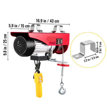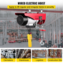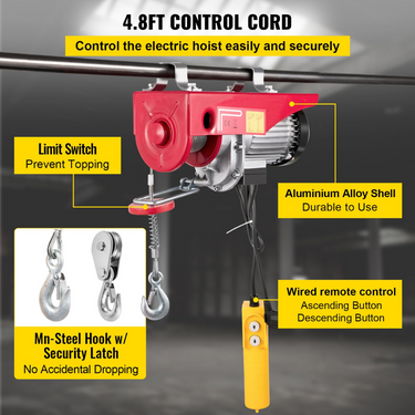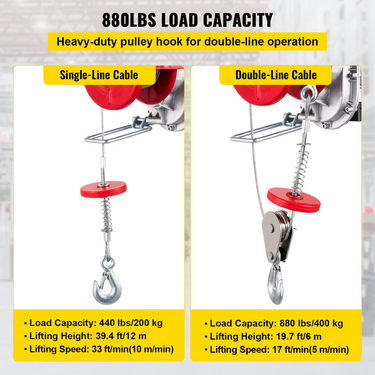 - Capacidade de carga de 400KG : O guindaste elétrico é capaz de levantar pequenos motores, engrenagens ou materiais de construção com cuidado. Suporta dois elevadores e possui gancho de segurança em aço. A capacidade e velocidade de carga de linha única é de 200 kg (440 lbs), 10 m/min (33 pés/min). A capacidade de carga e velocidade da linha dupla é de 400 kg (880 lbs), 5 m/min (17 pés/min).