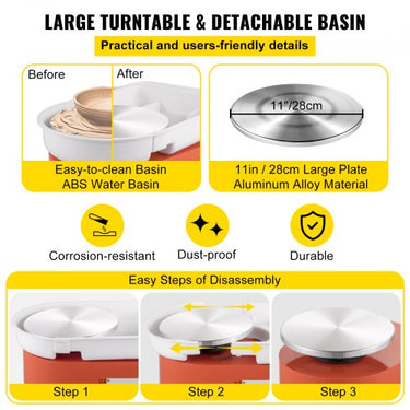 - · Roda de liga de alumínio de 11": O prato giratório de liga de alumínio de 11"/28 cm permite que os usuários desenhem peças grandes rapidamente. Além disso, um tanque de água fechado evita a erosão da lama na fuselagem. Além disso, é removível para facilitar a limpeza.