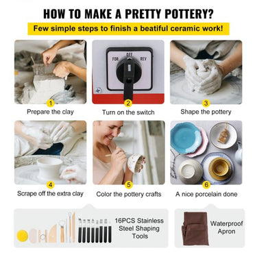 - · Ferramentas úteis de modelagem: fornecemos 16 ferramentas de modelagem para refinar rapidamente seus designs e um avental à prova d'água para que a argila não fique em suas roupas. Essas ferramentas complementares podem economizar custos e energia significativamente.