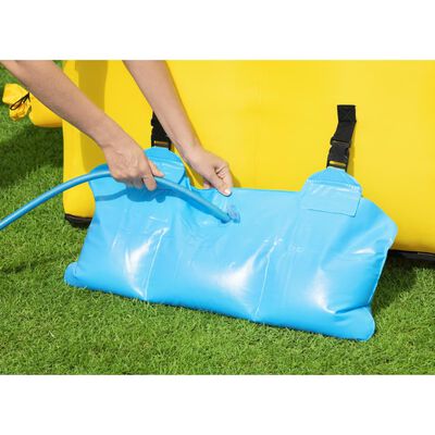 O parque de brincar é durável e seguro, com costuras duplas e paredes laterais em rede no pico mais alto. O insuflador resistente pode encher o parque aquático em menos de 2 minutos. O dispensador de água incorporado molha-o aleatoriamente e mantém o escorrega escorregadio. O canhão de água incluído permite mirar e disparar um esguicho. As crianças podem ainda escalar a parede com a corda incluída. Os seus filhos vão certamente adorar este parque aquático de brincar! O escorrega é adequado apenas para 1 criança de cada vez, com um peso máx. de 54 kg. Um máximo de 5 crianças podem brincar ao mesmo tempo na piscina.