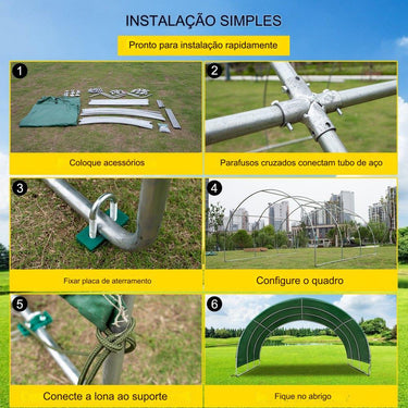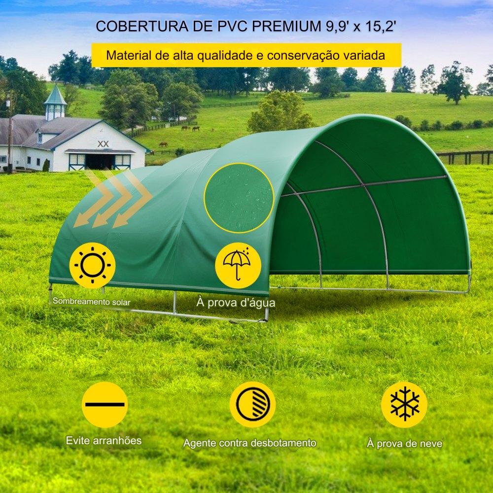 Este artigo descreve um abrigo para pastagens feito de canos galvanizados redondos, o que torna a estrutura robusta e resistente. O revestimento premium em pó protege a barraca da ferrugem e corrosão. A cobertura da barraca é feita de PVC moderno e possui função à prova d'água. O material é tratado com agentes de proteção solar e branqueamento para evitar danos decorrentes da exposição ao sol, prolongando a vida útil da tenda e protegendo os animais. O design da barraca inclui um arco circular no topo, que facilita a limpeza de água e neve, e um piso sólido para maior resistência. Também possui projetos de Crossbol para manter a estabilidade mesmo em condições climáticas adversas. A instalação é simples e flexível, com acessórios fornecidos e recomendação de duas pessoas para uma montagem eficiente. Com um tamanho de 3,04 x 3,05 x 1,68 m, o abrigo pode acomodar vários animais ao mesmo tempo. É frequentemente utilizado em fazendas e quintais familiares. O modelo do abrigo é SS-GZ-SCBHS0001, a cobertura é feita de PVC e a moldura é de metal galvanizado. O tamanho do produto é de 9,9 x 10 x 5,5 pés / 3,04 x 3,05 x 1,68 m, e o tamanho interno é de 9,8 x 9,8 x 5,4 pés / 2,99 x 3 x 1,65 m. O peso do produto é de 72,7 lbs / 33 kg.