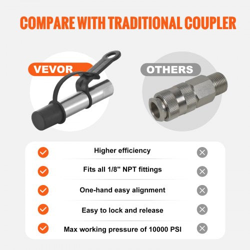 Compatibilidade máxima: mergulhe em um mundo onde um acoplador serve para todos! Nosso acoplador de graxa se adapta bem a qualquer pistola de graxa com conexão NPT de 1/8", seja manual, elétrica ou pneumática. De máquinas agrícolas a ferramentas de oficina, é como o controle remoto universal do mundo das pistolas de graxa e aumenta sua eficiência. Robusto e seguro: Construído em aço para mola e aço nº 45, nosso acoplador para pistola de graxa permanece firmemente travado em pressões de até 10.000 PSI, eliminando o risco de vazamento. A espessura extra da trava de 3 mandíbulas e da estrutura da mola garante que ela não se solte sob alta pressão. Operação com uma mão: encaixe, trave e role! Basta um simples empurrão e a ponta da nossa pistola de graxa entra em ação. O mecanismo em forma de engrenagem e a mola reforçada foram projetados para facilitar sua vida e garantir uma fixação estável e um travamento seguro. O que importa é tornar as suas tarefas de abastecimento suaves e eficientes. mostre mais