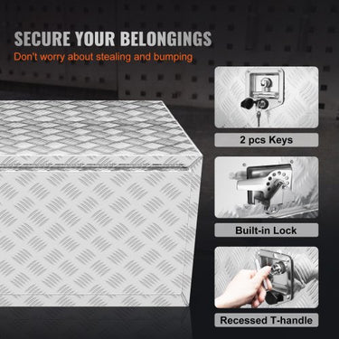Caixa de ferramentas versátil para qualquer lugar: Você está cansado de ferramentas desorganizadas? A caixa inferior de caminhões VEVOR pode ser montada não apenas no piso de caminhões e carretas, mas também em diversos locais, como na traseira de um motorhome ou na carroceria de uma caminhonete. Esta caixa de caminhão pode armazenar tudo de maneira organizada, desde ferramentas de manutenção até equipamentos de camping. Nada pode entrar: A vedação de borracha na caixa de ferramentas garante uma vedação hermética quando fechada e evita assim a penetração de umidade ou água. Isso significa que você pode manter suas coisas secas mesmo em dias chuvosos, sem se preocupar com ferrugem ou corrosão. Guarde seus pertences com confiança nesta caixa de ferramentas! Construída para durar: a liga de alumínio durável desta caixa de ferramentas oferece proteção contra ferrugem e resistência à corrosão incomparáveis pelo ferro. A placa espessa e o padrão do piso garantem que a caixa do caminhão não seja facilmente danificada ou arranhada, mesmo durante longas viagens. mostre mais