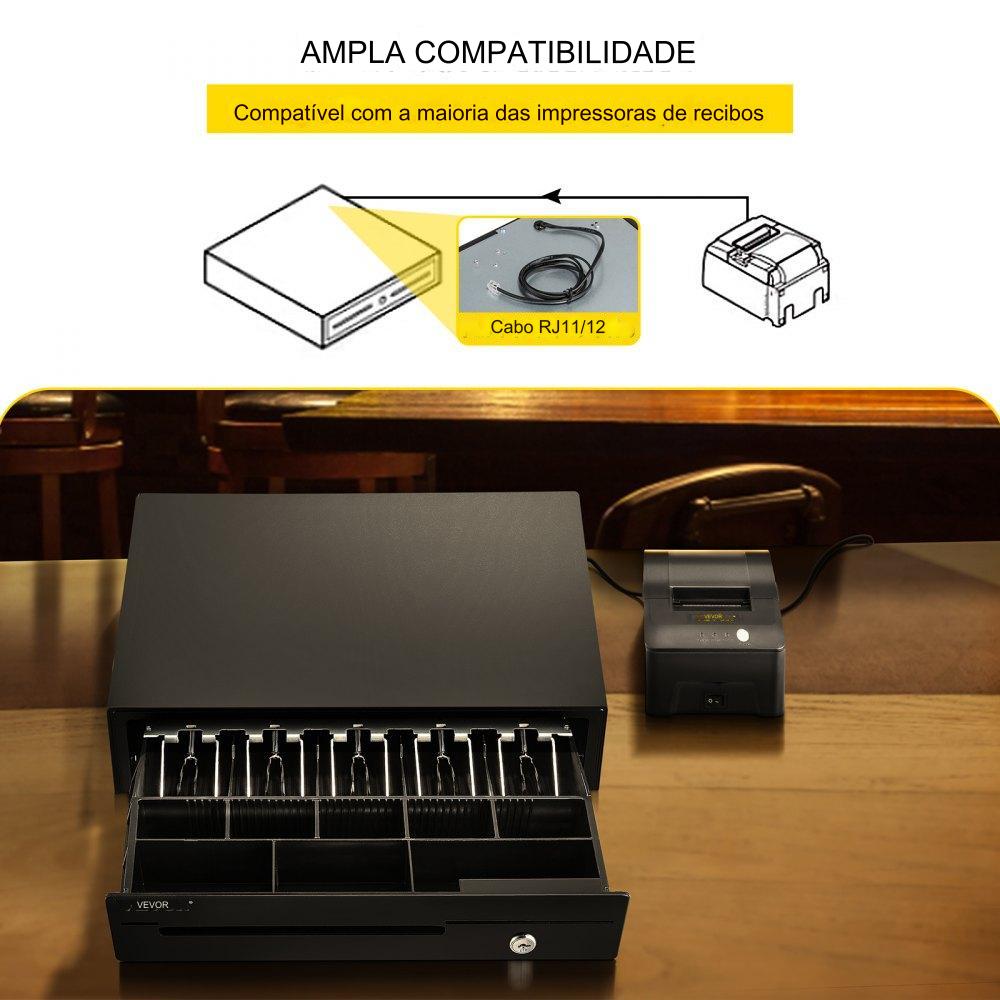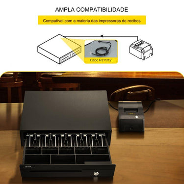 Com relação à compatibilidade, essa gaveta de dinheiro é fabricada com uma interface RJ11/RJ12, sendo compatível com várias impressoras de recibos, tais como Epson, MUNBYN, Star Micronics, Rongta e BestXin Yin. Isso permite sua integração perfeita com diferentes sistemas de ponto de venda existentes no mercado.