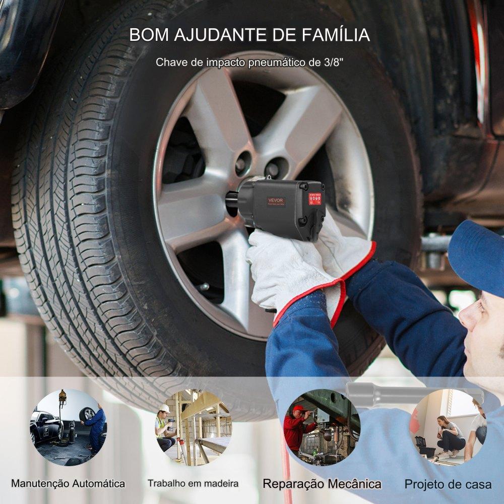 Com uma ampla gama de aplicações, a chave de impacto de ar comprimido VEVOR de 0,95 cm pode soltar parafusos e porcas em automóveis leves, além de ser útil para reparação e manutenção doméstica. Seu consumo médio de ar é de 0,13 m3/min, e a pressão de operação recomendada é de 6,2-8,3 bar.