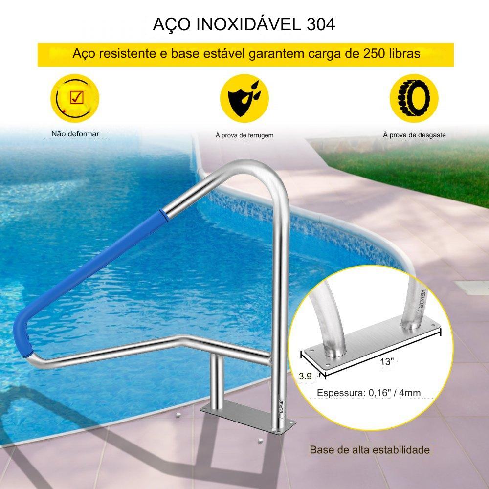 Este artigo é um corrimão de piscina feito de aço inoxidável 304 de alta qualidade, que garante resistência à ferrugem e durabilidade a longo prazo. Possui uma alça de nylon com 122 cm de comprimento e uma tampa ergonômica de 137 x 91,4 cm para garantir a segurança dos membros da família ao entrar e sair da piscina. A tampa de nylon proporciona proteção confortável para as mãos contra lesões causadas pelo clima e reduz o risco de escorregões, mesmo com as mãos molhadas. A tampa também é removível para instalação temporária.