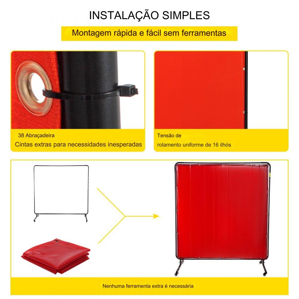 Em resumo, a cortina de soldagem descrita é feita de um vinil resistente ao fogo de 0,43 mm de espessura, com dimensões de 6 x 6 pés (183 x 183 cm). Ela possui uma estrutura durável de aço carbono resistente, com pintura preta para evitar oxidação e corrosão. A cortina possui rodas flexíveis para movimento suave, instalação fácil sem ferramentas, ajuste flexível para diferentes tamanhos de espaço e proteção UV de nível 6. Sua cor vermelha garante maior visibilidade e segurança durante o uso.