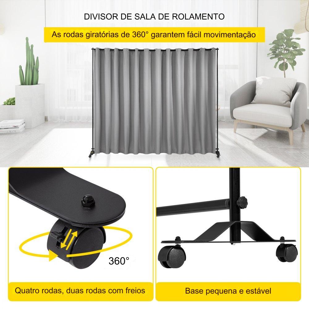 Rodas giratórias de 360° para maior mobilidade: O divisor de sala possui 4 rodas silenciosas e omnidirecionais, sendo que 2 delas possuem freios. Essas rodas garantem um movimento suave e fácil manobrabilidade, enquanto os freios permitem uma parada rápida e segura.