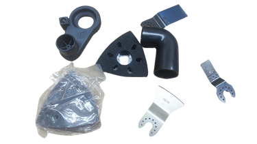 Acessórios inclusos: 2 lâminas de corte de imersão, 1 lâmina de corte segmentada, 1 raspador, 1 placa de lixa triangular, 18 folhas de lixa, 1 conexão para extração de poeira