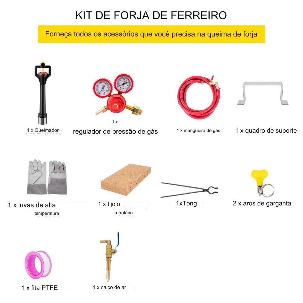 Ao adquirir o Smithy, você também receberá uma série de acessórios de ferraria completos, incluindo luvas de alta temperatura, um alicate, uma mangueira de gás, um regulador de pressão de gás, uma pedra à prova de fogo, uma estrutura de suporte, um queimador, dois pneus doloridos, uma banda de PTFE e uma cunha de ar.