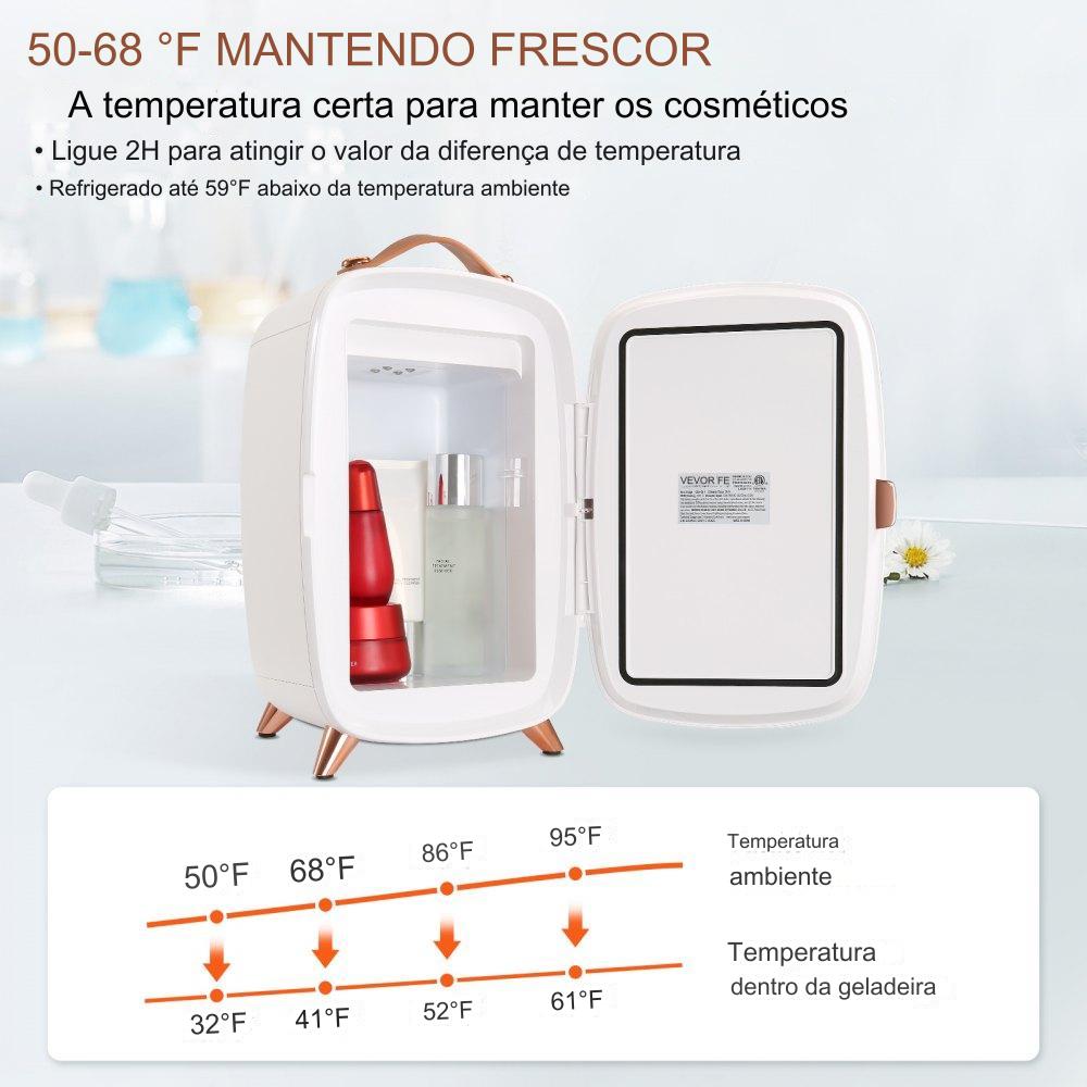 A geladeira mini com ajuste inteligente de temperatura é ideal para armazenar alimentos, bebidas, leite materno, produtos de cuidados com a pele e medicamentos. Ela tem a capacidade de se adaptar automaticamente à temperatura interna da geladeira, com um modo de refrigeração que pode atingir até 59 ℉ / 15 ºC de temperatura ambiente. Em apenas duas horas, a geladeira atinge a capacidade de resfriamento adequada.