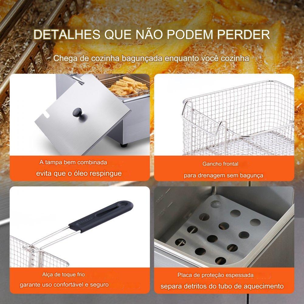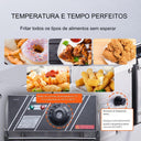 Temperatura ajustável: Com os reguladores de temperatura independentes em cada tanque, você tem total controle sobre a fritura. Basta ajustar a temperatura de 50 a 200 °C e você estará pronto para começar! Também há um dispositivo de proteção térmica que desliga automaticamente a energia quando o óleo atinge 230 °C.