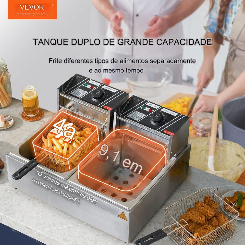 Especificações técnicas: Potência: 1500 W + 1500 W; Tamanho da cesta de fritura: 7,3 x 8,1 x 3,9 polegadas / 185 x 205 x 100 mm; Tamanho do tanque de óleo: 12,8 x 10,4 x 5,7 polegadas / 325 x 265 x