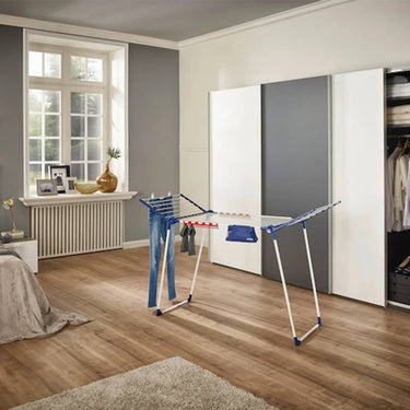 O seu comprimento de secagem é de 20 m e oferece espaço para quase duas cargas de roupa. Roupas compridas tais como toalhas de banho ou calças, secam nas abas laterais dobráveis. A sua altura de 107 cm garante que nada toca no chão. Devido ao seu formato ondulado, as duas barras externas das abas são perfeitamente adequadas para pendurar cabides. Estão incluídos cinco cabides “à prova de vento”. Encaixam e não caem das barras, mesmo com ventos fortes. Também estão incluídos quatro suportes para pequenos artigos de lavandaria e um saco de molas. Graças às molas, meias, lenços ou calças podem ser pendurados fácil e rapidamente sem precisar de molas adicionais.