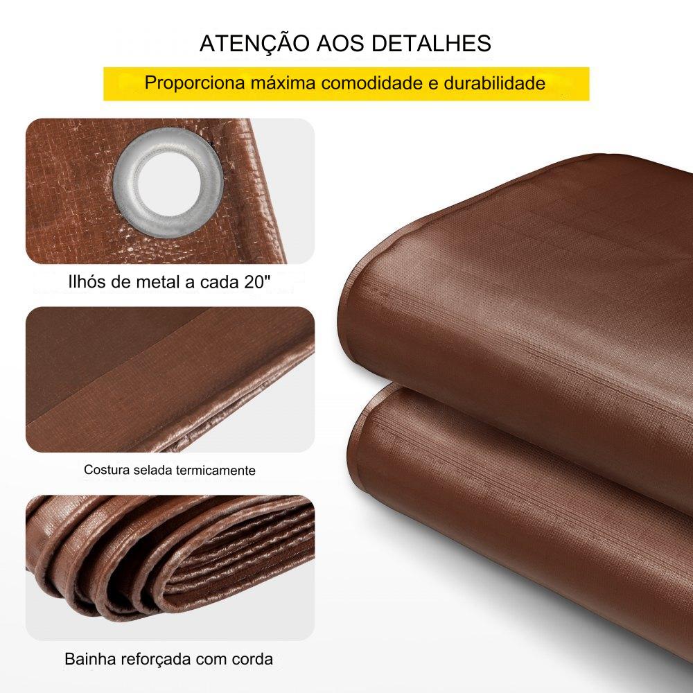 Além disso, a lona possui bordas e cantos reforçados para aumentar a estabilidade e durabilidade. Projetada para resistir à chuva, neve, luz solar e vento, essa lona marrom é resistente em qualquer clima. Não deixe o tempo danificar suas coisas, confie na nossa lona para cobrir e proteger tudo.