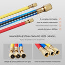 As mangueiras reforçadas são ultralongas, medindo 5 pés (152,4 cm) cada, e são fornecidas em um conjunto de 3. Feitas de PVC com quatro camadas de reforço, essas mangueiras são capazes de suportar uma pressão de até 600 psi, com uma pressão de ruptura de 3000 psi. Além disso, as conexões das mangueiras estão equipadas com vedantes antiderrapantes para evitar o afrouxamento durante a operação, reduzindo significativamente o risco de vazamentos e contaminação.