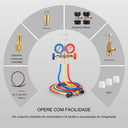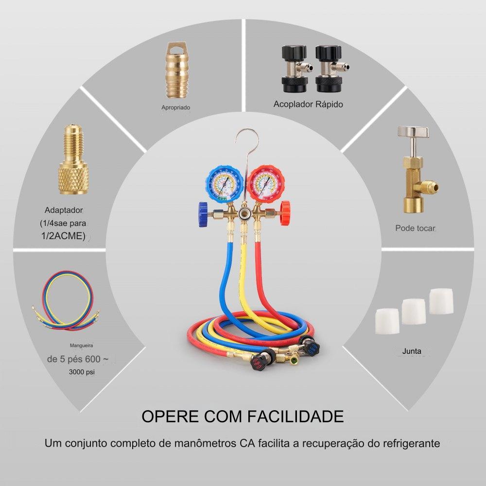 O Conjunto Profissional de Manômetros de Três Vias é compatível com os refrigerantes R134A, R12, R22 e R502, tornando-o adequado para sistemas de ar condicionado automotivos, sistemas de ar condicionado domésticos e a manutenção de geladeiras. Com esse conjunto, é possível realizar facilmente o processo de faça você mesmo em casa.