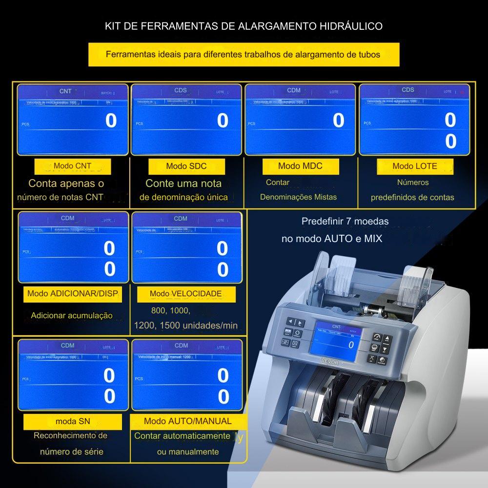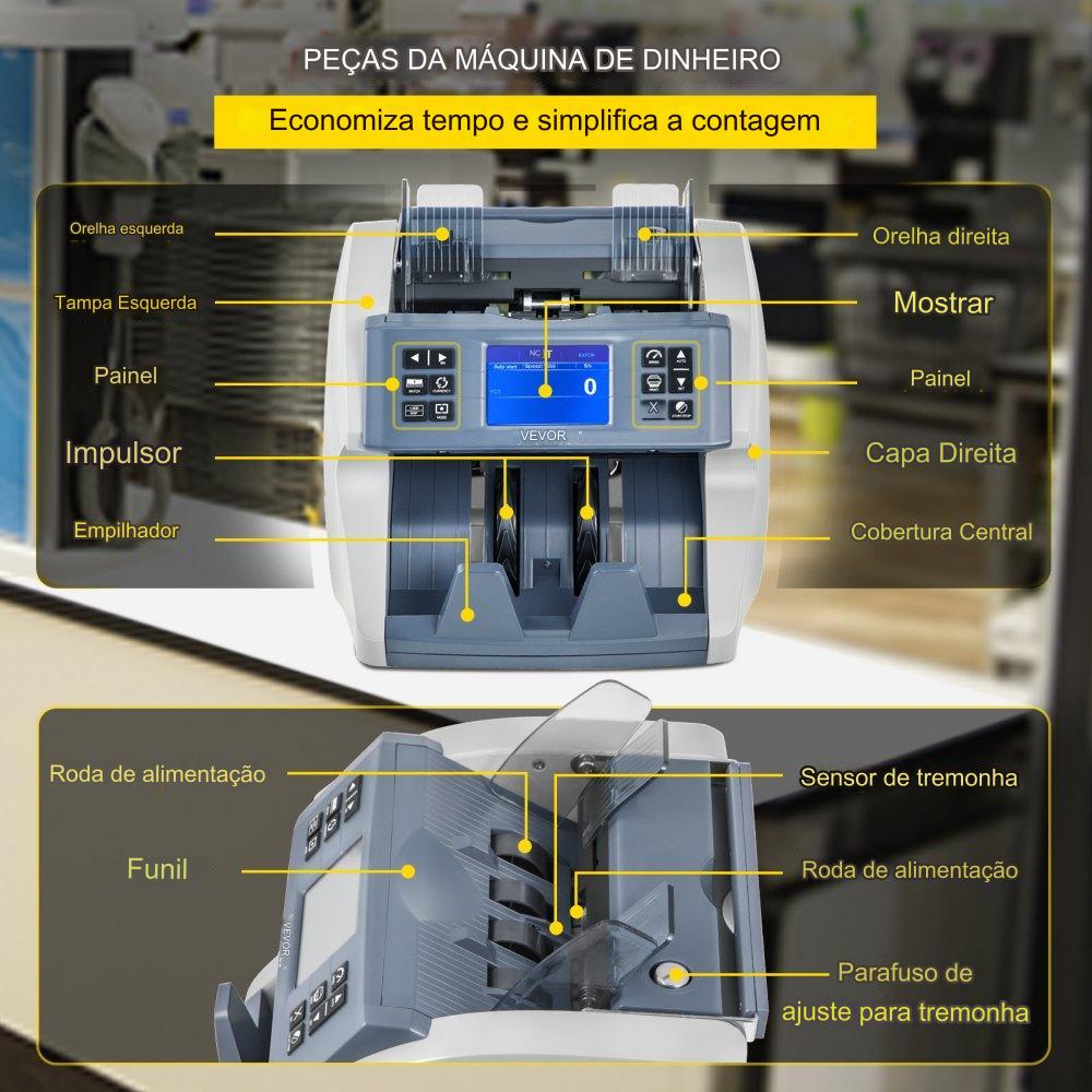 Dimensões do produto: 10,63 "x12,2" x10,24 " / 270x310x260 mm; Alimentação: AC 110V/220V, 50Hz/60Hz; Consumo de energia: ≤50 W; Peso bruto: 15,43 lbs / 7 kg; A máquina de contagem de dinheiro modelo SH-07C é equipada com funções integradas para autenticidade das faturas, garantindo a proteção contra perdas. Com alta eficiência e grande capacidade de contagem, a máquina possui vários modos de trabalho para atender às necessidades de diferentes indústrias. Seu design humanizado permite um uso confortável e seguro, proporcionando facilidade de manuseio na contagem de dinheiro. Com velocidade de contagem superior a 800 peças por minuto, a máquina possui um funil com capacidade para 500 notas e bolsas com capacidade para 200 notas. O tamanho das notas contáveis varia de 2,36 "x4,33" a 3,54 "x7,28" (60x110 mm a 90x185 mm), com espessura mínima de 0,0031 "(0,08 mm) e espessura máxima de 0,0047" (0,12 mm). O produto é adequado para uso em diferentes indústrias e seu peso bruto é de aproximadamente 15,43 lbs / 7 kg.