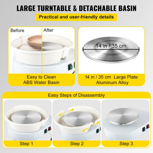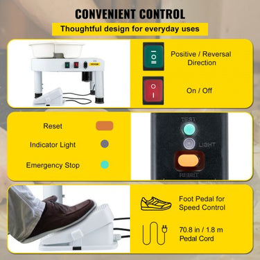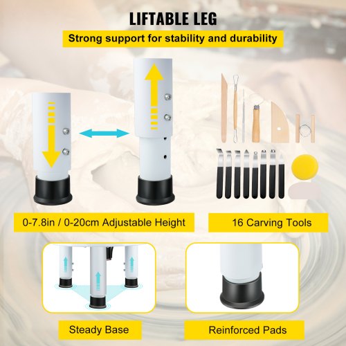 Qualidade Premium: a plataforma giratória em liga de alumínio de 14 polegadas/35 cm permite aos usuários desenhar peças grandes rapidamente. Bacia de água em ABS durável fixada para evitar respingos de lama e removível para fácil limpeza. Estrutura compacta com design humanizado e excelentes detalhes proporcionam aos usuários uma experiência mais confortável. Desfrute de cerâmica e escultura no conforto da sua casa. Design flexível da parte superior do elevador: Esta versão atualizada da base robusta permite que o tampo da mesa seja facilmente levantado ou abaixado dentro de uma faixa de 0 a 7,8 polegadas/0 a 20 cm, proporcionando conveniência para usuários de todos os tamanhos. Além disso, a estrutura triangular garante que a máquina não balance durante o funcionamento. Opere e controle o formato da sua peça de forma estável. Pedal independente: Os botões do painel de controle à prova d'água ajudam você a controlar a direção da roda simplesmente tocando no botão no painel da tela. Juntamente com um motor sem escova de 450 W, o pedal durável pode atingir uma velocidade de 0-300 rpm com baixo ruído de 60 dB. Ele pode ser girado no sentido horário ou anti-horário para atender a diferentes necessidades. mostre mais