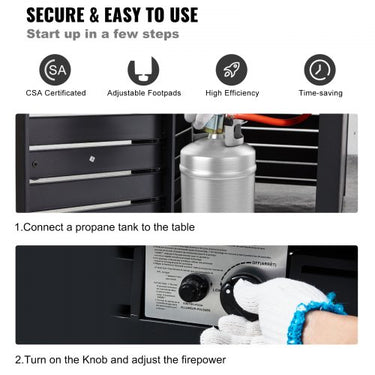 Sobre este artigo Quer fazer uma ótima festa no pátio?: Uma festa no pátio é diferente de uma festa interna. É preciso levar em consideração o clima e encontrar uma forma de reunir todos em um local central. Uma mesa de fogo é a combinação perfeita de estilo e funcionalidade que pode proporcionar o calor e a atmosfera necessários para se divertir! Espaço mais que suficiente: uma mesa de fogo de 109 cm não só proporciona calor, mas também oferece espaço suficiente para bebidas, comidas e lanches para sua festa ou uma refeição romântica ao ar livre. Pare de deixar seus convidados segurando bebidas a noite toda e organize uma festa no pátio onde os convidados podem sentar, relaxar e se divertir! Sinta o Calor (50.000 BTU): Esta mesa de fogo a gás funciona com um tanque de propano de aproximadamente 9L e pode atingir até 50.000 BTU. Ele fornecerá calor a qualquer pessoa próxima à sua mesa de fogo por aproximadamente 9 horas - não deixaremos você no frio! A ignição por pulso garante uma operação conveniente. Não há nada pior do que comida fria. É por isso que garantimos que a sua comida permaneça quente durante todo o festival.