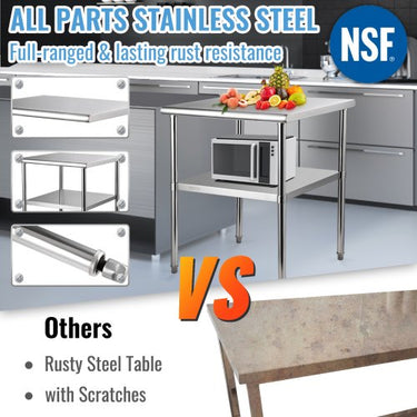 Material resistente e durável: Todas as partes da nossa mesa de trabalho são feitas de aço inoxidável 201, o que aumenta sua resistência à ferrugem e corrosão em todos os tipos de ambientes. É certificado pela NSF e atende aos mais altos requisitos legais de segurança e durabilidade. A mesa tem um aspecto elegante e é difícil de riscar devido à sua superfície jateada. Pode ser facilmente limpo com um pano e permanece estável mesmo após uso prolongado. Sente-se e prepare seus pratos favoritos com facilidade. Mesa de trabalho resistente: Cansado de ficar sem espaço na prateleira? Nossa mesa de preparação de aço inoxidável possui uma prateleira inferior para espaço de armazenamento adicional. A prateleira superior de 30 x 30 polegadas (76,2 x 76,2 cm) acomoda itens de até 500 libras (226 kg) e a prateleira inferior de 26 x 26 polegadas (66 x 66 cm) acomoda itens de até 300 libras (136 kg). Isso permite que você armazene convenientemente os suprimentos usados com mais frequência. O tampo de 15 mm de espessura com densidade aprimorada aumenta a durabilidade e estabilidade desta mesa. Empilhe seus ingredientes favoritos e cozinhe como nunca antes! mostre mais