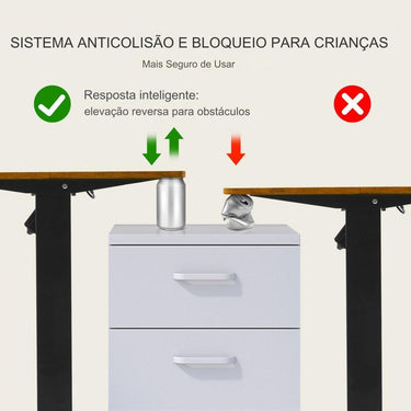 A mesa ajustável possui tecnologia anti-colisão, que garante que ela se mova na direção oposta ao levantar, evitando colisões. Além disso, possui um modo de segurança infantil ativado com pressão de 5 segundos na tecla "S", garantindo a proteção das crianças e prevenindo acidentes.