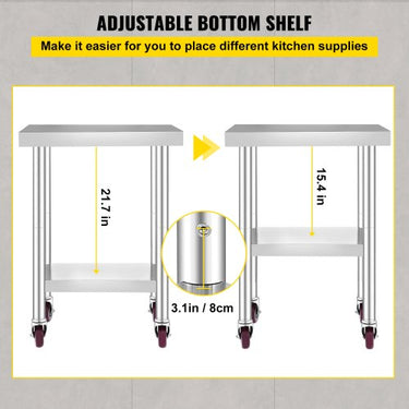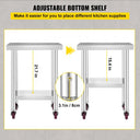 Material sólido como rocha: Material: Aço inoxidável; Diâmetro do tubo: 1,9 polegadas/4,8 cm; Espessura da camada superior: 2,2 polegadas/5,5 cm; Espessura da camada inferior: 1,8 polegadas/4,5 cm. Nossa mesa de cozinha é fabricada em aço inox, com tratamento de superfície trefilado, que proporciona excelente resistência à corrosão, durabilidade e fácil limpeza. Além disso, esta mesa de trabalho oferece-lhe uma grande superfície de trabalho, para que não tenha de sobrecarregar as suas bancadas. Capacidade de carga de 150kg: Bandeja superior: 220lbs/100kg; Prateleira inferior: 110 lbs/50 kg. Prateleira superior: 24 x 18,1 x 2,2 polegadas / 61 x 46 x 5,5 cm; Prateleira inferior: 18,9 x 13 x 1,8 polegadas / 48 x 33 x 4,5 cm. A mesa de cozinha em aço inoxidável oferece uma área espaçosa para preparação e armazenamento de alimentos. Há também uma prateleira inferior para espaço de armazenamento adicional. Aqui você pode armazenar farinha, açúcar, desinfetante, toalhas, tigelas, tábuas de corte e muito mais para manter todos os suprimentos usados com mais frequência organizados e ao seu alcance. mostre mais
