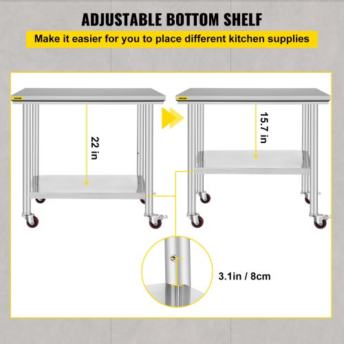 Material sólido como rocha: Material: Aço inoxidável; Diâmetro do tubo: 1,9 polegadas/aproximadamente 4,8 cm; Espessura da camada superior: 2,2 polegadas/aproximadamente 5,5 cm; Espessura da camada inferior: 1,6 polegadas/aproximadamente 4 cm. Nossa mesa de cozinha é fabricada em aço inox, com tratamento de superfície trefilado, que proporciona excelente resistência à corrosão, durabilidade e fácil limpeza. Além disso, esta mesa de trabalho oferece-lhe uma grande superfície de trabalho, para que não tenha de sobrecarregar as suas bancadas. Capacidade de carga de 160 kg: prateleira superior: 176 lbs/80 kg, prateleira inferior: 176 lbs/80 kg. Prateleira superior: 36 x 24 x 2,2 polegadas / 91 x 60 x 5,5 cm; Prateleira inferior: 29,9 x 18,1 x 1,6 polegadas / 75,9 x 45,9 x 4 cm. A mesa da cozinha em aço inoxidável oferece uma área espaçosa para preparação e armazenamento de alimentos. Há também uma prateleira inferior para espaço de armazenamento adicional. Aqui você pode armazenar farinha, açúcar, desinfetante, toalhas, tigelas, tábuas de corte e muito mais para manter todos os suprimentos usados com mais frequência organizados e ao seu alcance. mostre mais