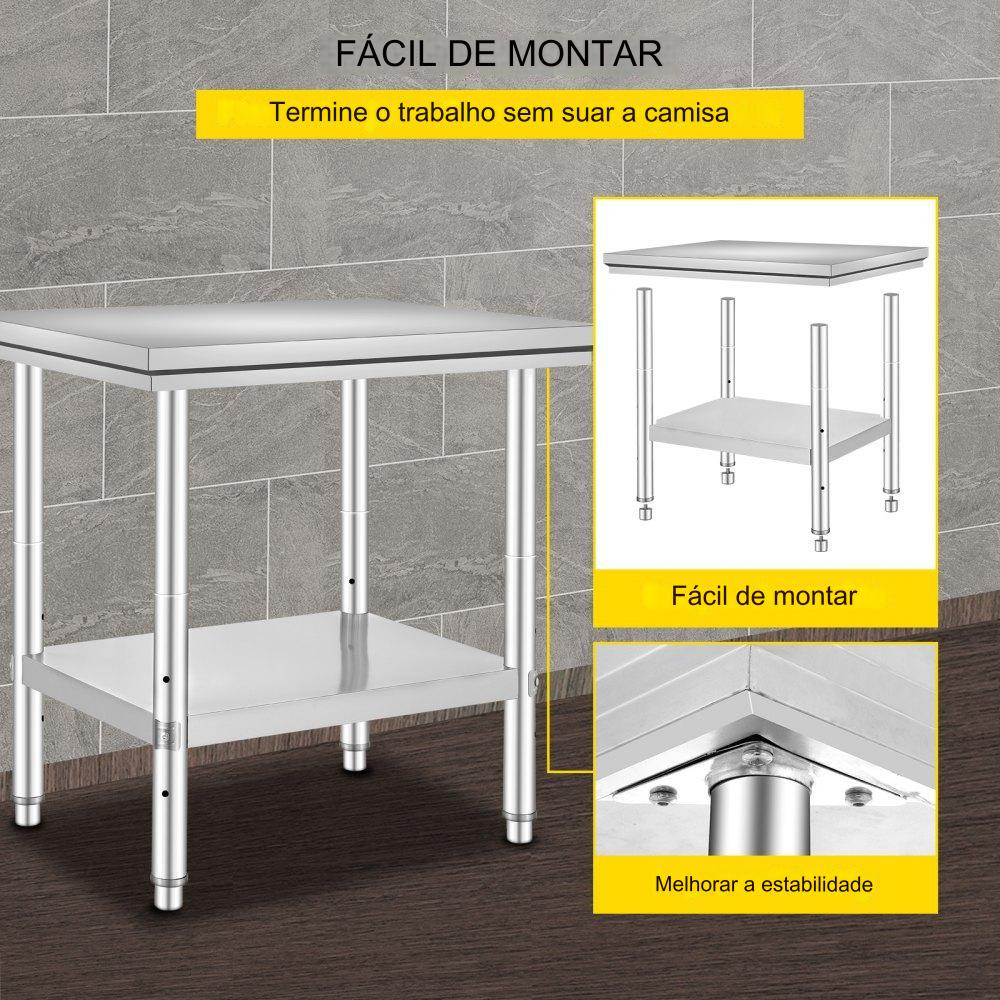 As dimensões da prateleira superior são 23,6 x 29,9 x 3 polegadas (60 x 76 x 7,5 cm), enquanto as dimensões da prateleira inferior são 18,1 x 24,4 x 1,6 polegadas (46 x 62 x 4 cm). Essas dimensões proporcionam uma área espaçosa para preparar e armazenar alimentos, além de uma sub-prateleira para armazenamento adicional.