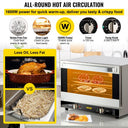 43Qt / 47L Interior Espaçoso: Apesar de sua estrutura compacta, nosso forno de convecção comercial tem capacidade de 43Qt (47L) e é perfeitamente dimensionado para preparar uma porção média de comida deliciosa. As dimensões do interior de 4 andares chegam a 18,5 x 15,4 x 9,8 polegadas / 47 x 39 x 25 cm, tornando-o ideal para festas ou uso comercial. Circulação total de ar quente: Em comparação com a fritura, assar com menos óleo e gordura pode contribuir para hábitos alimentares mais saudáveis. Apoiado na potência de 1600 W e no ventilador eficiente, nosso forno comercial de bancada distribui o calor uniformemente por todo o corpo e assa os alimentos rapidamente. 2 botões fáceis de usar controlam com precisão a temperatura de aquecimento e o tempo de cozimento. Faixa de temperatura de aquecimento: 150-500℉ (65-250℃); Configuração de tempo: 0-120 min Você pode ajustar o ciclo de cozimento de acordo com suas necessidades específicas. Caixa de aço inoxidável e porta de vidro temperado: O interior e exterior robusto de aço inoxidável são extremamente duráveis, resistentes à ferrugem e corrosão e fáceis de limpar. Está também equipado com uma porta de vidro temperado de parede dupla que evita a perda de calor e permite acompanhar sempre o progresso da cozedura no interior. A alça de liga Al de toque frio é confortável e segura na mão e a luz do forno torna sua comida atraente. mostre mais