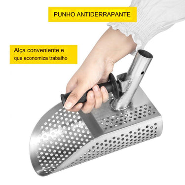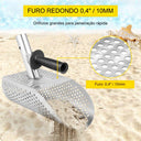 "Capacidade de Filtragem Eficiente" - A peneira rápida possui orifícios redondos com um diâmetro de 10 mm, permitindo a filtragem de moedas, anéis, jóias e outros pequenos objetos valiosos presentes na areia. Os orifícios são projetados para possibilitar uma rápida passagem da areia, garantindo a eficiência no processo de filtragem.