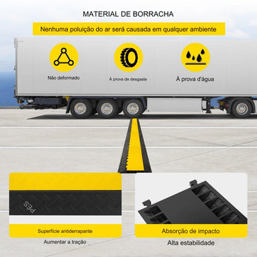 Modelo: CP-R02-3(7507001); Quantidade: 3 pcs; Canal: 2; Tamanho do canal (L x A): 3 x 3 cm (1,18 x 1,18 polegadas); Capacidade máxima de carga: 5443 kg (12000 lbs) por eixo; Material principal: borracha, PVC; Cor: preto e amarelo; Temperatura de funcionamento: Mais de -4,4 ℃ (-40 ℃); Tamanho da fita de aviso (L x B): 15 m x 4 cm (50 pés x 1,57 polegadas); Dimensões do produto (L x L x A): 98 x 24 x 4,5 cm (38,58 x 9,45 x 1,77 polegadas); Tamanho da embalagem (L x W x A): 102 x 25,5 x 15,2 cm (40,16 x 10,04 x 5,98 polegadas); Peso líquido: 19,5 kg (43 lbs); Peso bruto: 20,6 kg (45,42 lbs); Manual: Link para download;