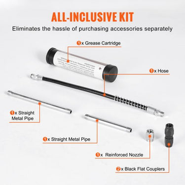 Pressão máxima de trabalho de 3500 PSI: Com nossa pistola de graxa com punho de pistola, você pode lidar facilmente com várias tarefas de lubrificação de alta pressão sem se preocupar com congestionamentos de graxa. É adequado para veículos, tratores, RVs, carros, eixos de transmissão, cilindros de direção, juntas universais, vigas de suspensão, juntas esféricas, cortadores de grama, chassis e eixos de transmissão, etc. Material de aço carbono de alta qualidade: A pistola de graxa para serviços pesados é feito de aço carbono de alta qualidade e cuidadosamente cromado, o que não é apenas cinco vezes mais resistente à corrosão, mas também torna seu trabalho de limpeza mais fácil e conveniente. Seja para uso doméstico ou industrial, ele pode suportar o uso a longo prazo e manter excelente desempenho e durabilidade. ACESSÓRIOS MULTIUSOS: O conjunto de pistola de graxa vem com uma série de acessórios multifuncionais incluindo uma mangueira, 2 acoplamentos planos pretos, 2 tubos retos de metal, 1 bico reforçado e 1 cartucho de graxa, que podem atender às suas diferentes necessidades. Vários acessórios funcionam juntos para economizar mais tempo e dinheiro. mostre mais