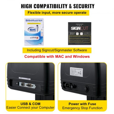 Controle digital eficiente: Largura máxima de alimentação: 28,3 polegadas/720 mm; largura máxima de corte: 24,8 polegadas/630 mm. Esta máquina de corte de vinil está equipada com um LCD que pode controlar efetivamente a velocidade e a potência. Os três rolos de pressão de mola dupla ajustáveis e as hastes de alumínio serrilhadas garantem que a plotadora de vinil funcione suavemente e sem emperrar. Escala precisa: O cortador de vinil é equipado com três lâminas intercambiáveis e uma régua divisória precisa. Precisão de corte: ±0,004 polegadas / ±0,01 mm. Atende às suas necessidades com nitidez de corte e tamanho de corte precisos. Nosso cortador plotter também possui um rolo de pressão que melhora a alimentação do papel. Alta compatibilidade e segurança: Esta máquina cortadora de vinil plotter está equipada com software Signcut e Signmaster e é compatível com MAC e Windows. Bloqueável via USB ou interfaces seriais. Ele também oferece suporte a outros softwares como Graph-Cut e Flexi. O cortador de folhas também possui uma função de parada de emergência para protegê-lo do perigo. mostre mais