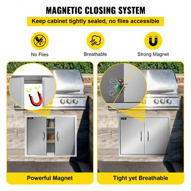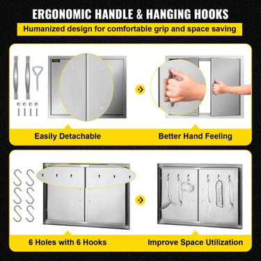 Construção com parede dupla: Dimensões totais (L x A): 77,5 x 53,3 cm (30,5 pol. x 21 pol.); Dimensões do recorte (L x A): 71,5 x 48 cm (28 polegadas x 18,8 polegadas). As portas da cozinha exterior são em aço inoxidável e são resistentes à corrosão e à abrasão. A porta de camada dupla com design perfeito é mais durável do que a de camada única. Este acabamento escovado torna a porta atraente e é fácil de limpar sem deixar manchas ou sujeira. Alças ergonômicas: As alças requintadas e ergonômicas das portas de acesso à churrasqueira encantam cada abertura com uma sensação confortável ao toque e não são fáceis de arranhar. Ao abrir as portas você encontrará 6 furos para pendurar ganchos na parede interna. Existem também 6 ganchos resistentes nos quais você pode pendurar pinças de churrasco, luvas e outros utensílios de churrasco nas portas para economizar espaço. Instalação sem complicações: com furos pré-perfurados na estrutura, nossas portas de armário de cozinha externas podem ser instaladas embutidas em qualquer parede em minutos. Você não precisa mais se preocupar em fazer furos na placa de aço. Então prepare-se para usar as portas requintadas logo após receber nosso pacote e experimente uma qualidade de vida moderna superior. mostre mais