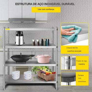 Este armazenamento de 4 níveis é feito de aço inoxidável, o que garante resistência excepcional, resistência à ferrugem e facilidade de limpeza, tornando-o ideal para uso a longo prazo. A barra transversal localizada na parte de trás do armazenamento estabiliza a estrutura, proporcionando maior segurança. Os pisos também possuem furos de ventilação para melhorar a circulação de ar e manter a frescura dos alimentos. _x000D_